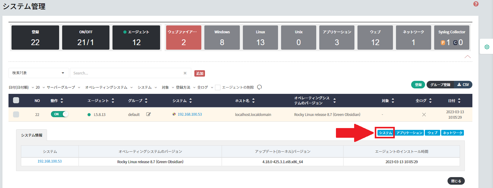 * システム > システム管理 > ログ取り込みサーバー(親)選択 > アプリケーションボタンをクリックします。