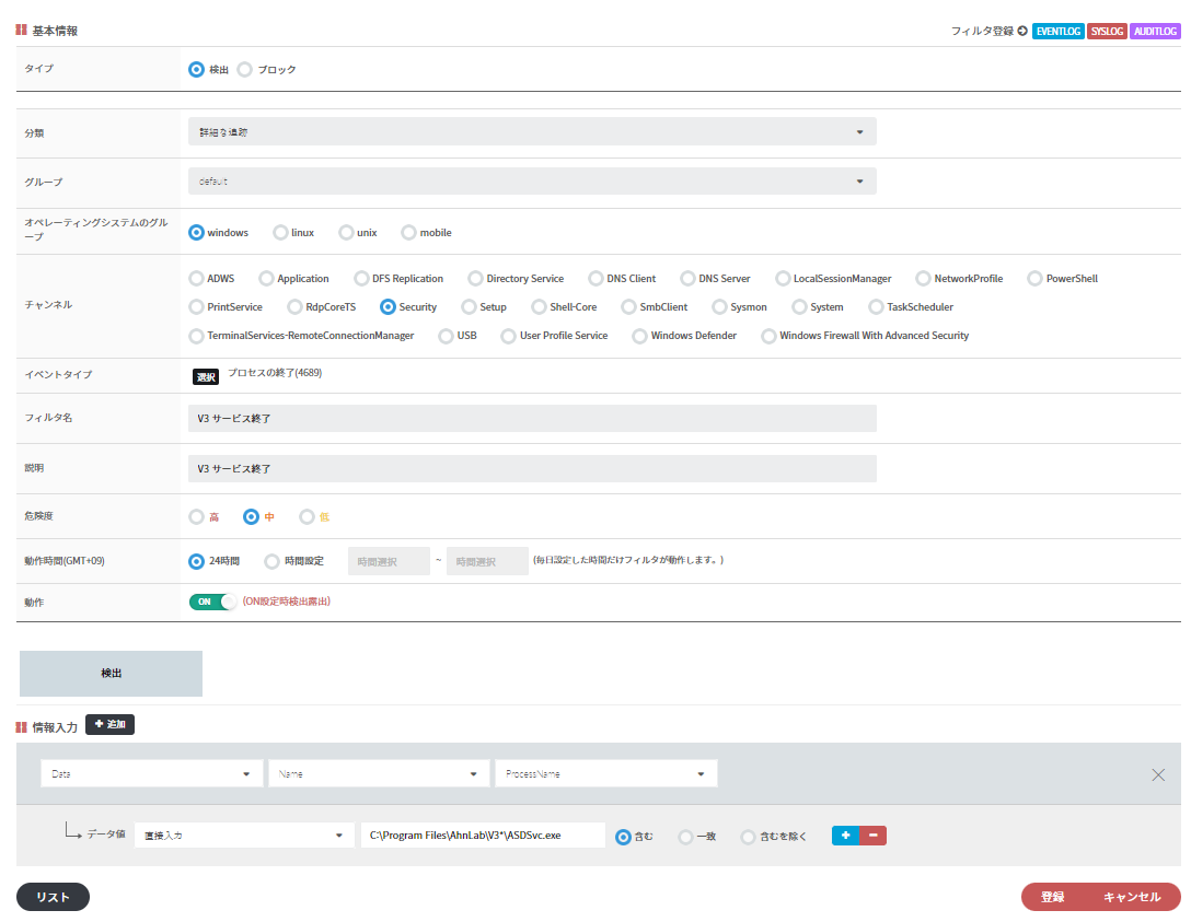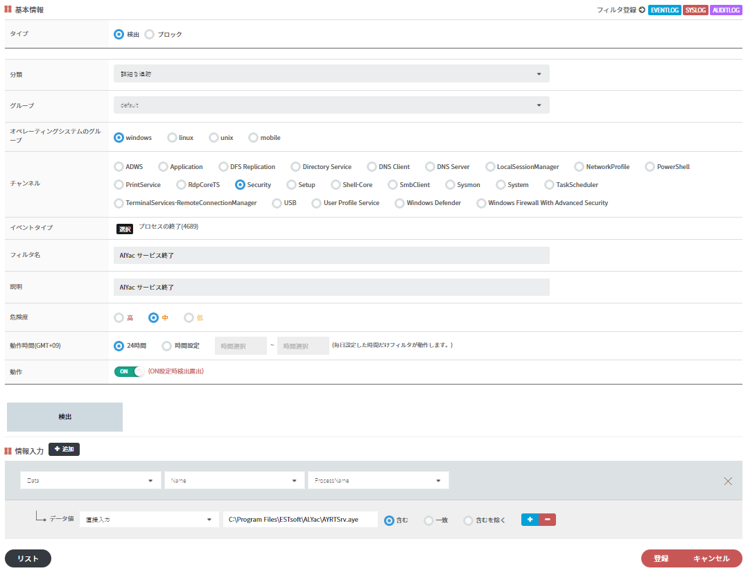 2-2. サーバーグループ選択 > オペレーティングシステムWindows選択 > Securityチャンネル選択 > 詳細追跡分類選択 > イベントタイプ選択