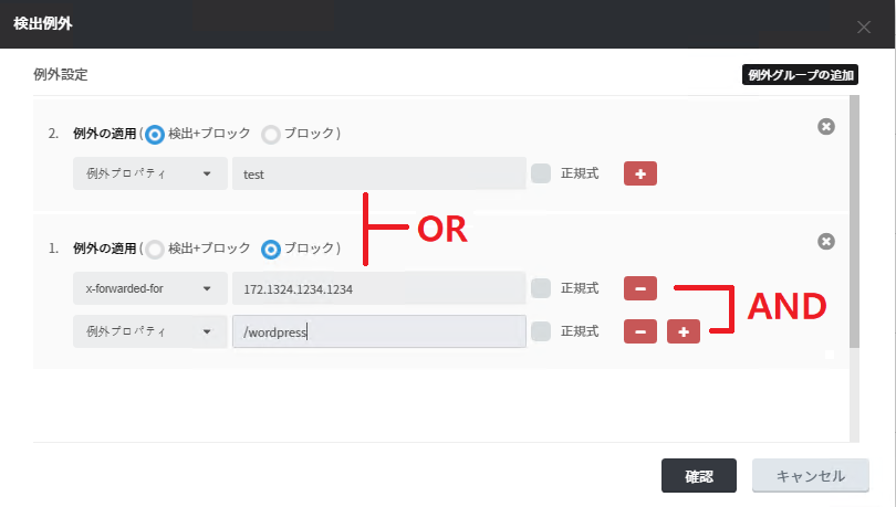 * 例）hostアドレスが123.34.45.1のログは検出されないように設定したい場合はhost選択後123.34.45.1を記入してください。