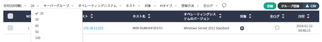 * 1ページあたりの見えるログの数を設定することができ、基本20で100ラインまで選択できます。