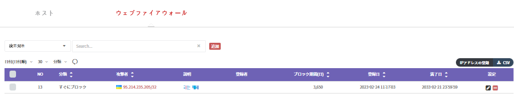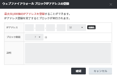 * ブロックリストに登録されたIPアドレスは直ちにブロックされ、削除時にブロックが解除されます。