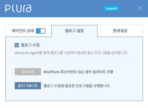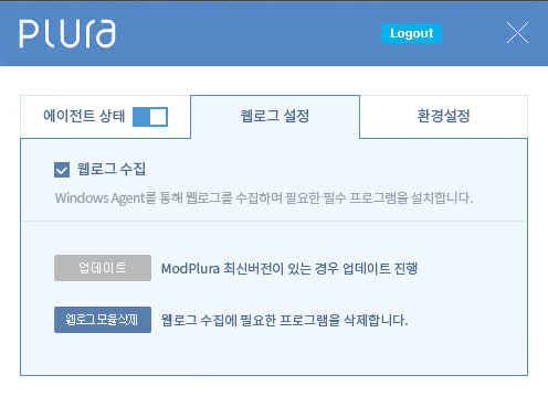 * 업데이트 버튼: 최신 웹 로그 모듈(ModPlura)이 있을 경우 버튼이 활성화되어 업데이트 가능
