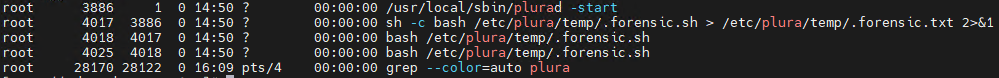 2-1-2. 명령어 `ps -ef | grep plura`를 실행하여 `.forensic.sh` 프로세스가 남아 있는 것을 확인합니다.