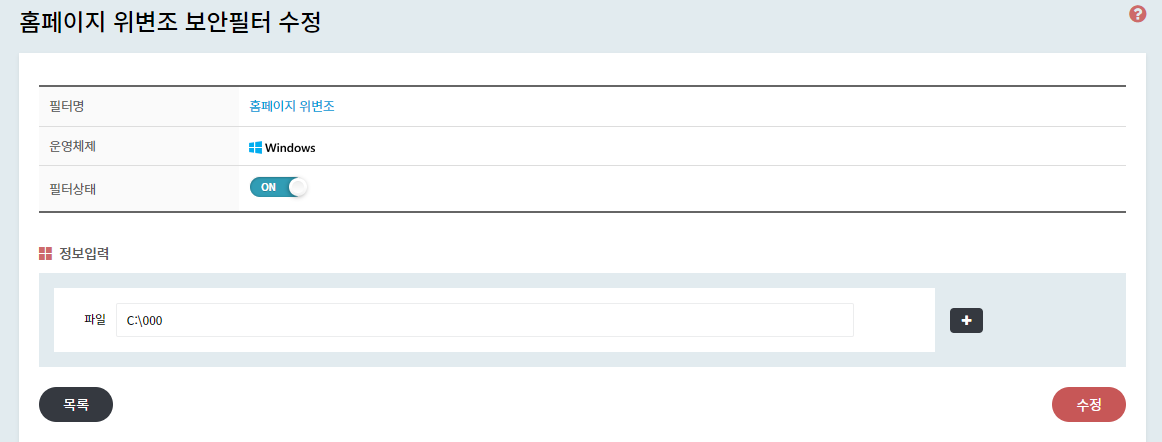 3-2. PLURA 페이지: 필터 > 보안 > 홈페이지 위변조 > 윈도우에서 해당 파일 경로(C:\000) 추가