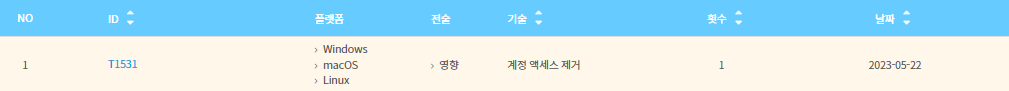 또한, PLURA 보안탐지 > 마이터 어택 > 리스트 메뉴에서도 탐지 결과를 확인할 수 있습니다.