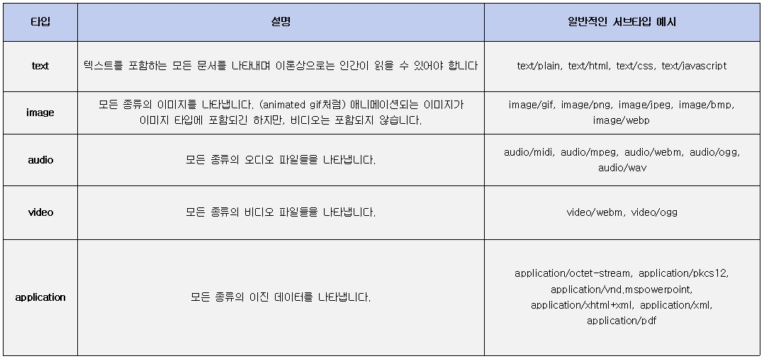 MIME 타입은 클라이언트에게 전송되는 문서의 종류를 알려주는 메커니즘입니다.