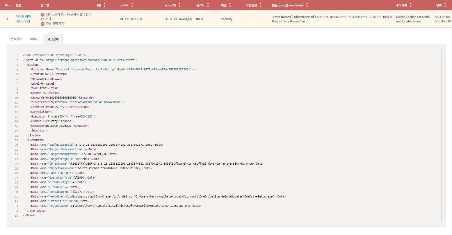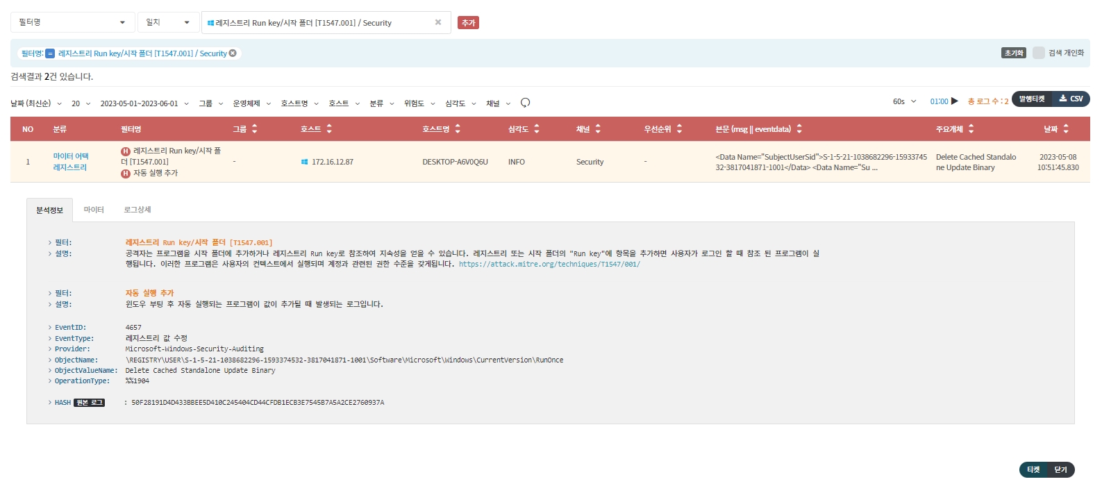 호스트 필터 탐지를 통해 레지스트리 위변조에 대한 수집된 로그를 확인할 수 있습니다.