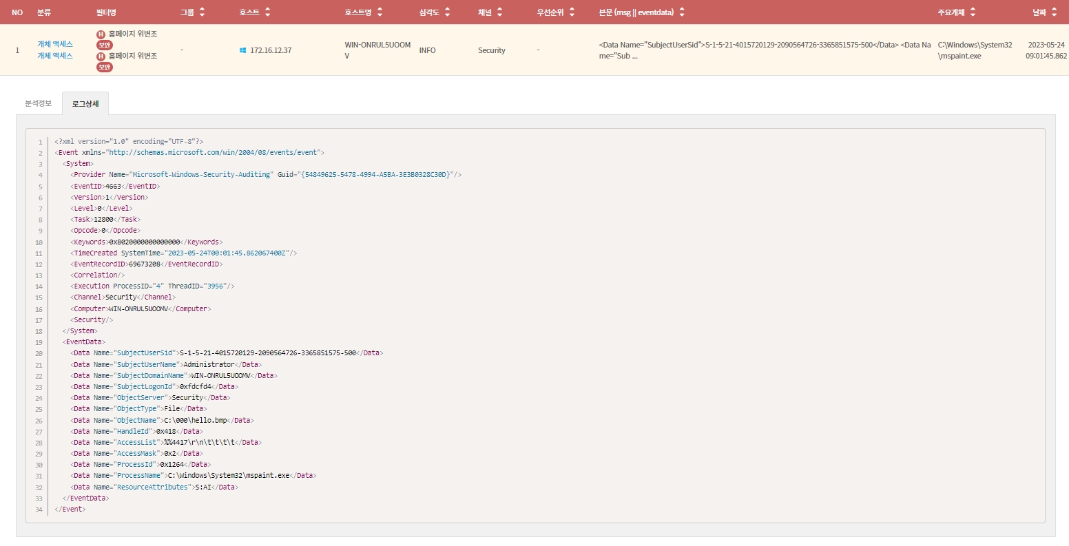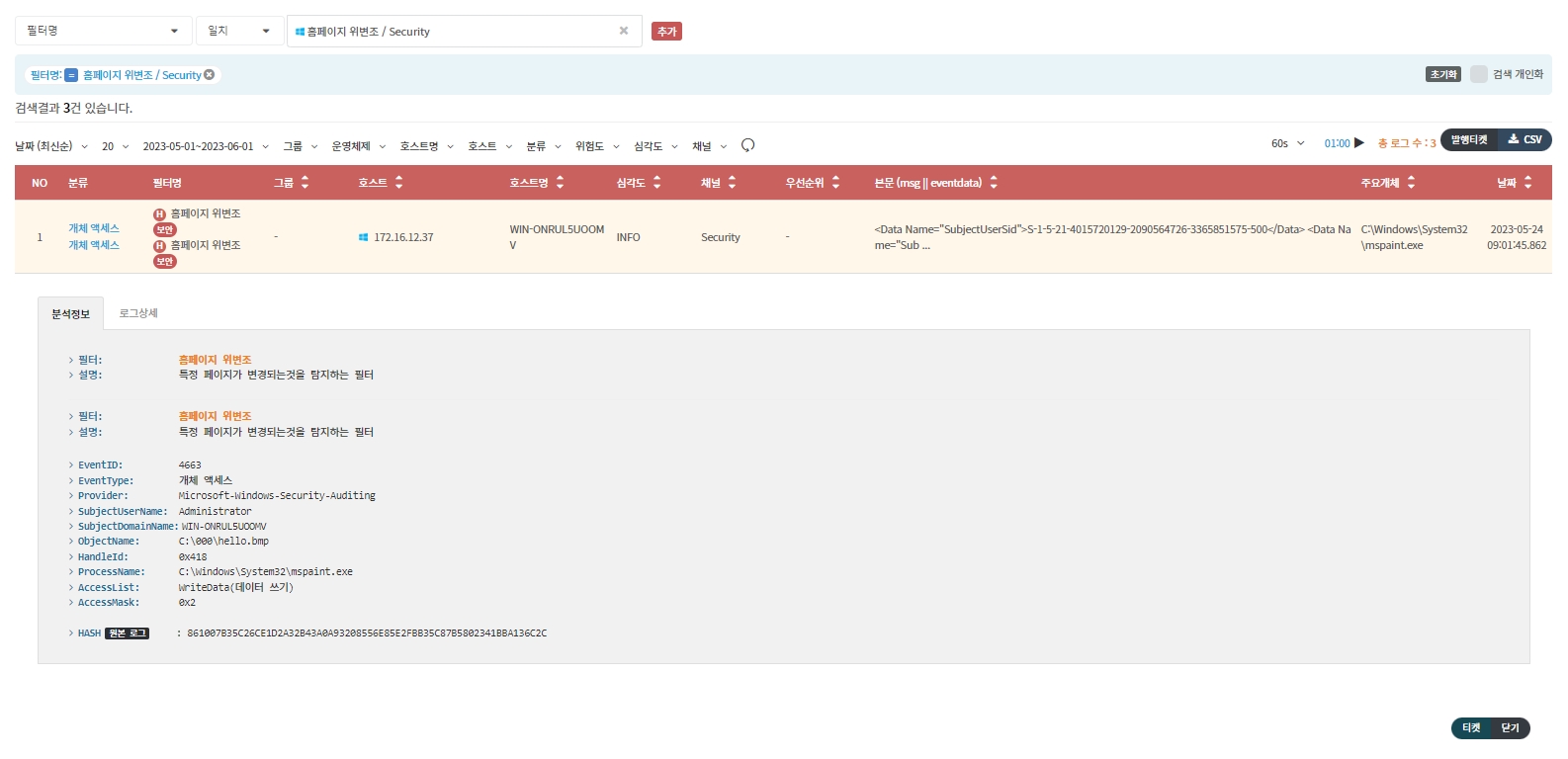 호스트 필터 탐지를 통해 파일 위변조에 대한 수집된 로그를 확인할 수 있습니다.