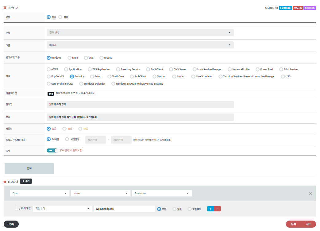 위그림과 같이 선택 후 ‘데이터 값’에 wail2ban block 을 넣고 하단의 ‘등록’ 버튼 클릭