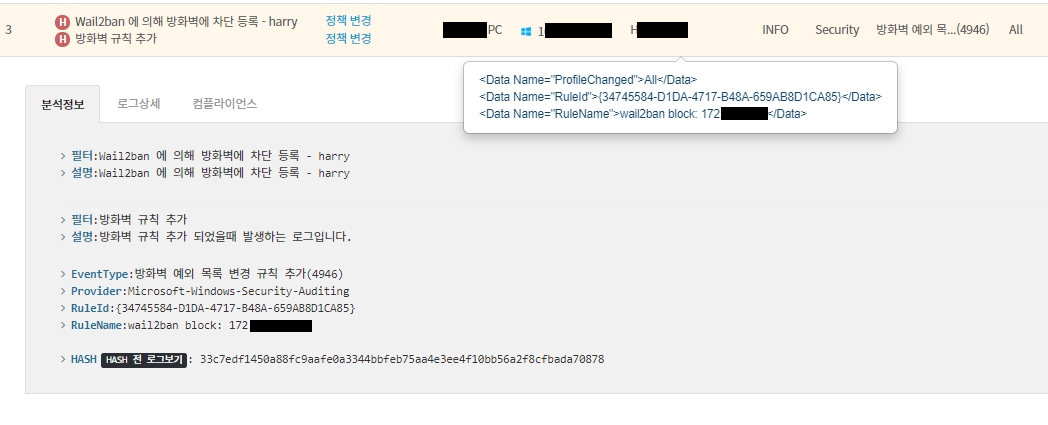 Wail2ban 을 이용해 RDP 무차별 대입공격에 대한 보안 설정을 했을 경우, Wail2ban 에 의해 윈도우 방화벽에 차단 등록되는 동작을 PLURA에서 탐지할 수 있습니다.