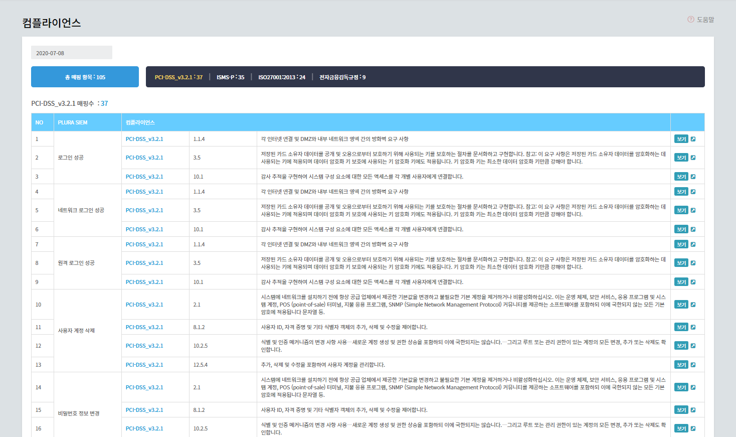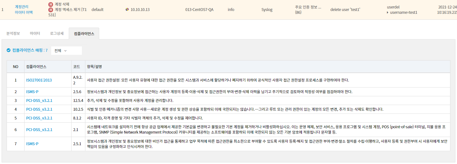 탐지 로그에서 컴플라이언스별 내용을 확인할 수 있습니다.