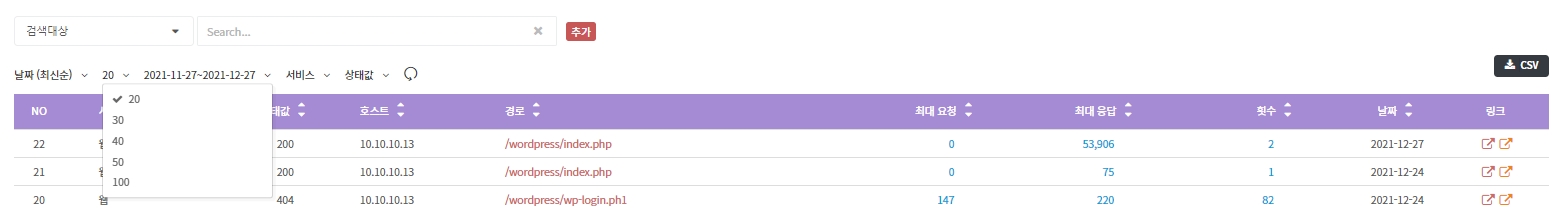 ํ ํ์ด์ง์์ ํ์๋๋ ๋ก๊ทธ ๋ผ์ธ์ ์๋ฅผ 20~100๋ผ์ธ๊น์ง ์ ํํ ์ ์์ต๋๋ค.