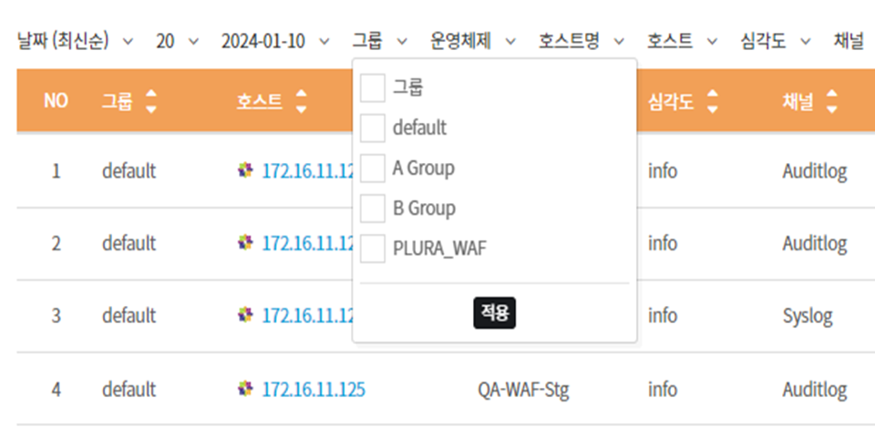 * 특정 호스트명을 선택하여 해당 호스트의 로그를 정렬할 수 있습니다.