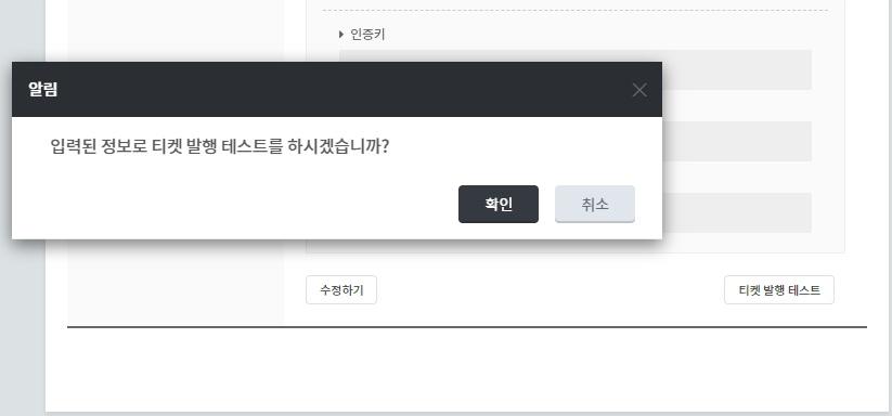 설정 완료 후, 우측 하단의 "티켓 발행 테스트" 버튼을 클릭하여 설정 확인