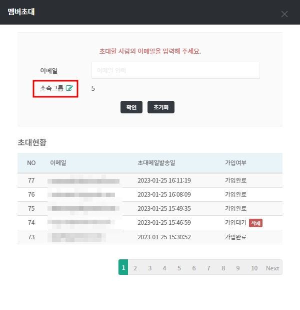 멤버를 추가할 때 소속 그룹을 지정하고, 필요 시 권한 변경 및 삭제가 가능합니다.