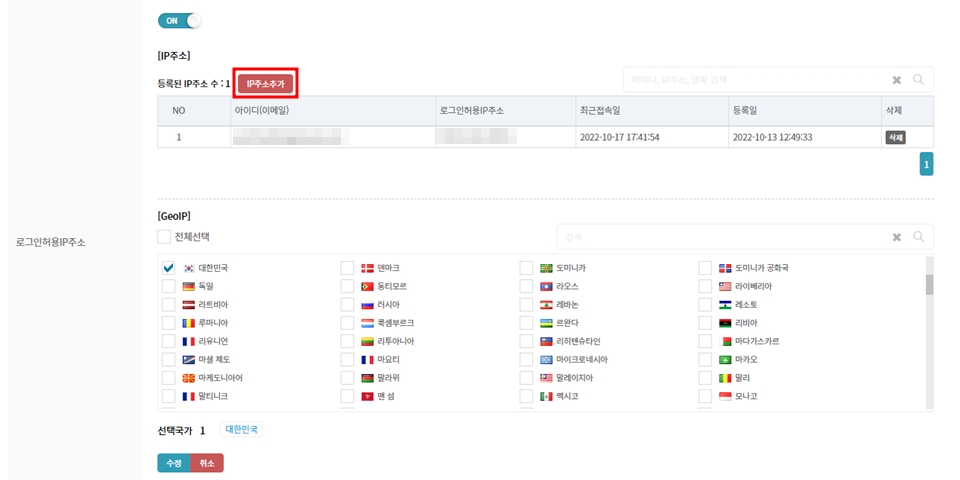 주의: 개별 IP 주소만 등록할 수 있으며, IP 범위 등록은 불가능합니다.