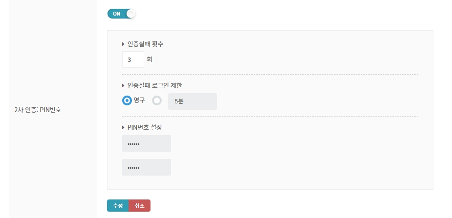 인증 실패 횟수 설정: PIN 번호 인증 실패 시 로그인 제한 조건을 설정할 수 있습니다.