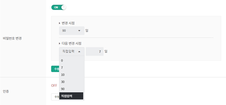 비밀번호 변경 시점: 비밀번호 변경 안내가 표시되는 시점을 설정합니다.