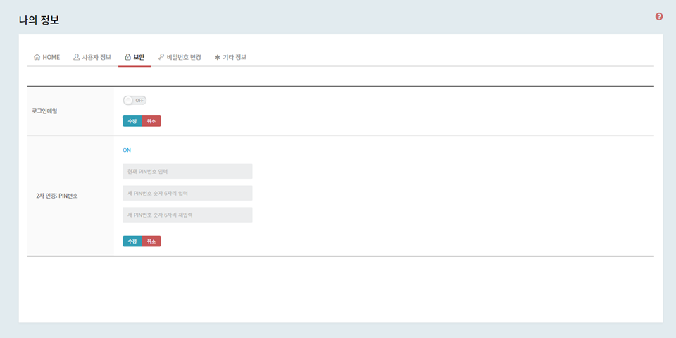 2차 인증 (PIN): PIN 번호를 설정 및 수정할 수 있습니다. ※ 2차 인증 설정 시 관련 메뉴가 활성화됩니다.