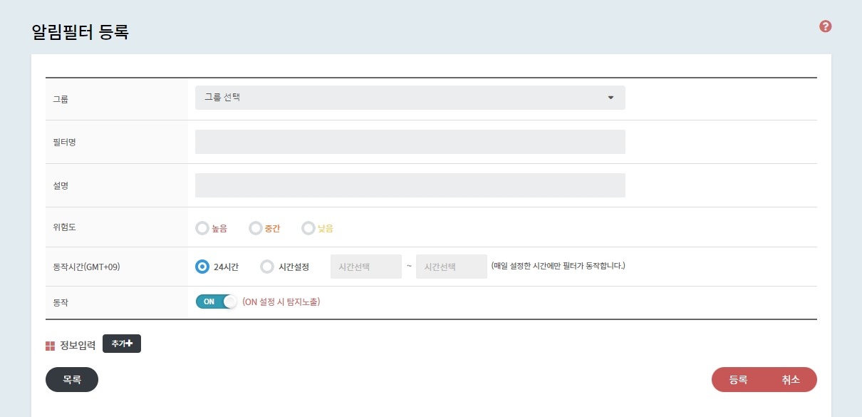 필터 등록 시 과탐(과도 탐지) 또는 오탐(오류 탐지)이 발생할 수 있으므로, 담당자와 충분히 논의 후 등록을 권장합니다.