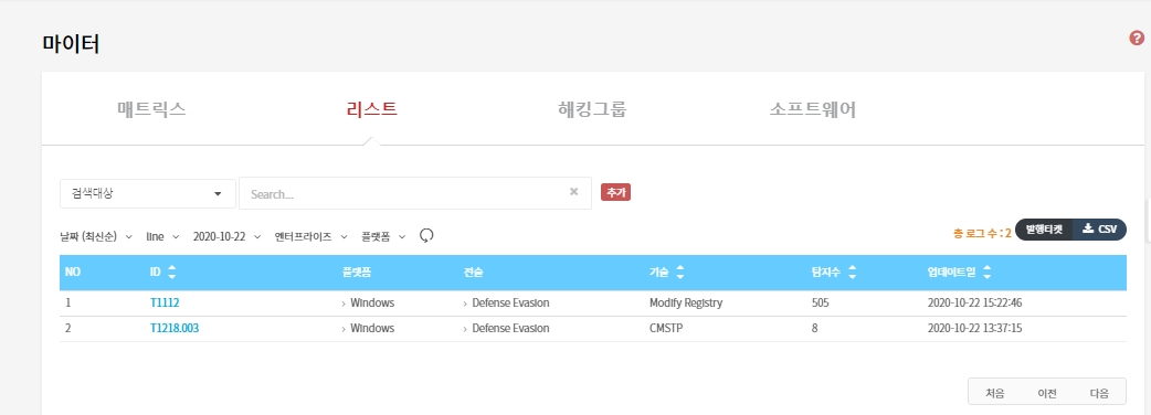 ID, 기술(Techniques), 플랫폼, 날짜, 전술 검색 기능 제공