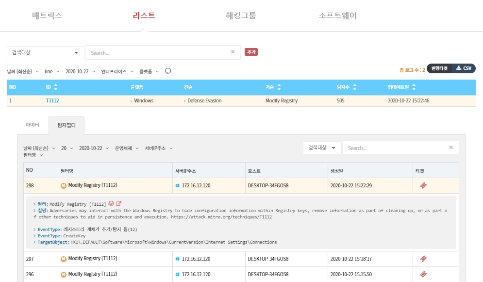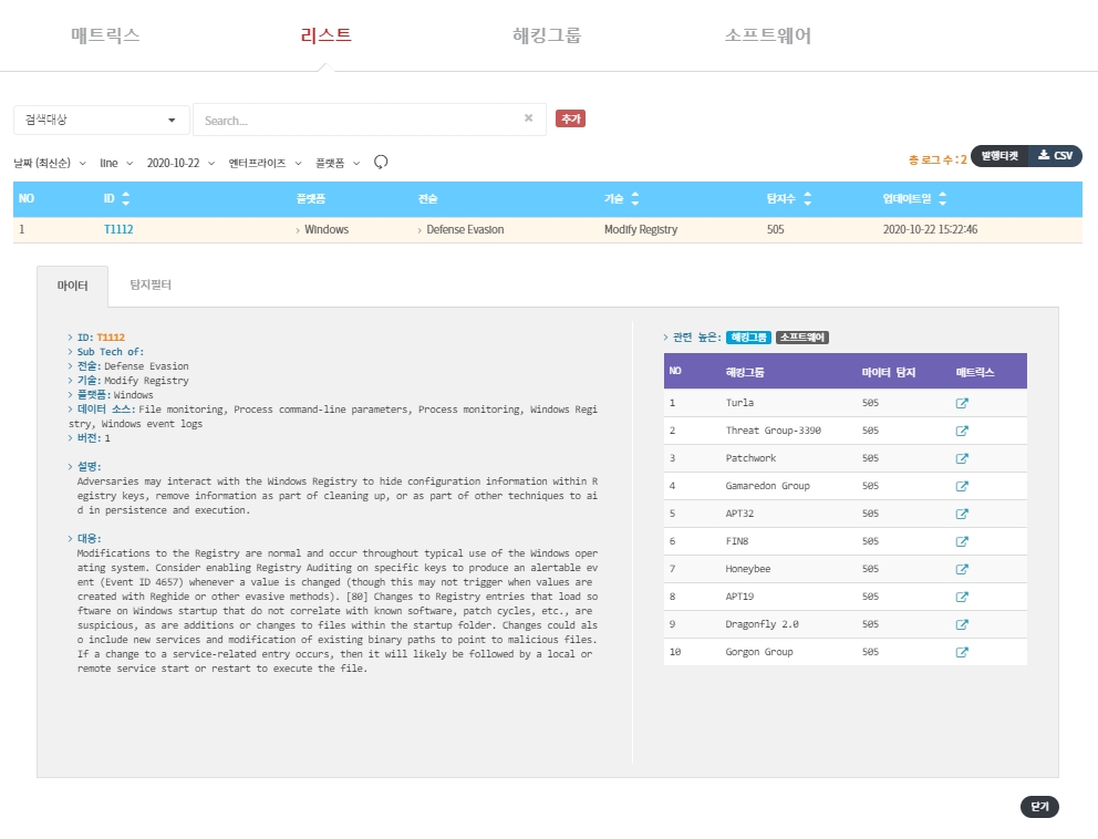 탐지된 ID에 매핑된 해킹 그룹 및 소프트웨어 정보 제공