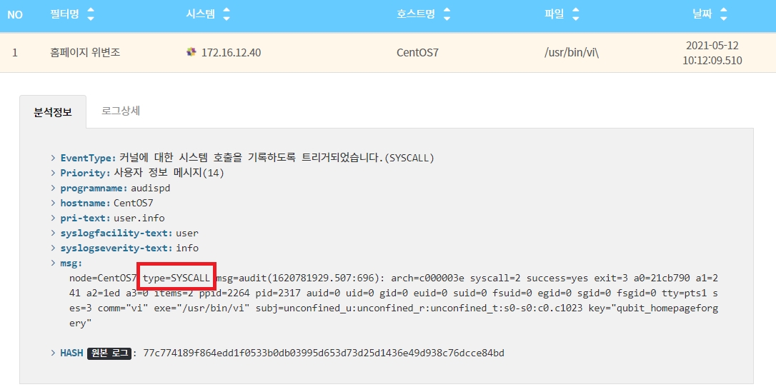 "type=SYSCALL"로 표시되는 경우, 변조된 파일 경로를 확인할 수 없습니다.