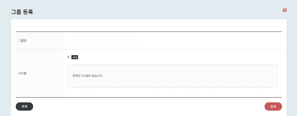 • 그룹 등록 버튼을 클릭한 후 그룹명을 입력하고, 추가할 시스템을 선택한 뒤 추가 버튼을 누릅니다.