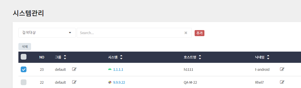 • 삭제하려는 시스템의 왼쪽 체크박스를 선택한 후 삭제 버튼을 클릭하면 해당 시스템이 삭제됩니다.