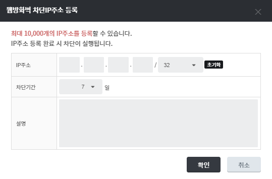 방어 > 차단 IP주소 > 웹방화벽 > IP주소 등록 버튼 클릭