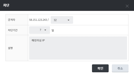 팝업 창에서 차단할 IP 주소와 차단 사유를 입력한 후 확인 버튼을 클릭합니다.