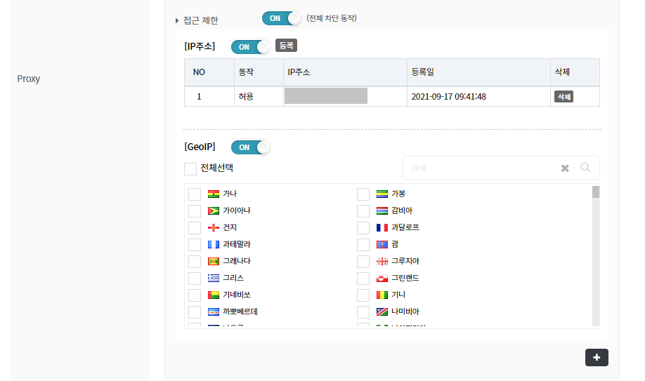 접근 제한을 활성화하면, 관리자가 직접 IP 주소와 GeoIP 설정을 할 수 있습니다.