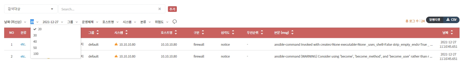 한 페이지에 표시되는 로그 라인 수를 20 ~ 100 라인 사이에서 설정할 수 있습니다.