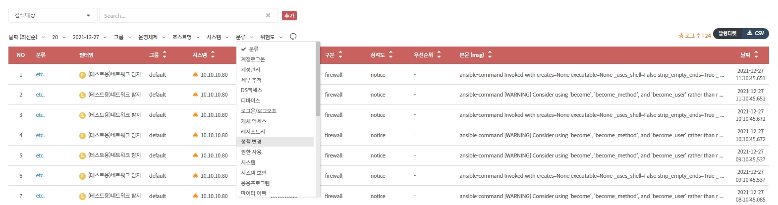 탐지 분류별로 로그를 정렬할 수 있습니다.