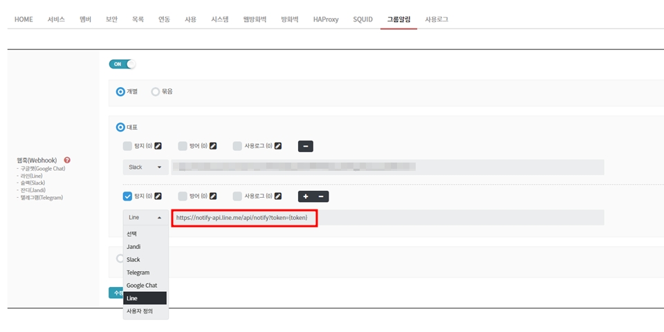 그룹별 웹훅: 로그 타입 및 그룹별로 다른 웹훅 주소로 수신 (사용로그는 지원하지 않음)