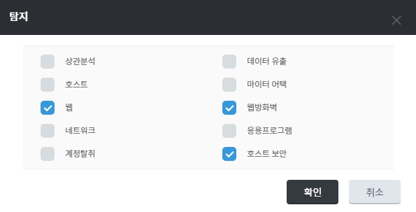 탐지 로그: 상관분석, 호스트, 웹, 네트워크, 계정 탈취, 데이터 유출, 마이터 어택, 웹방화벽, 응용 프로그램, 호스트 보안