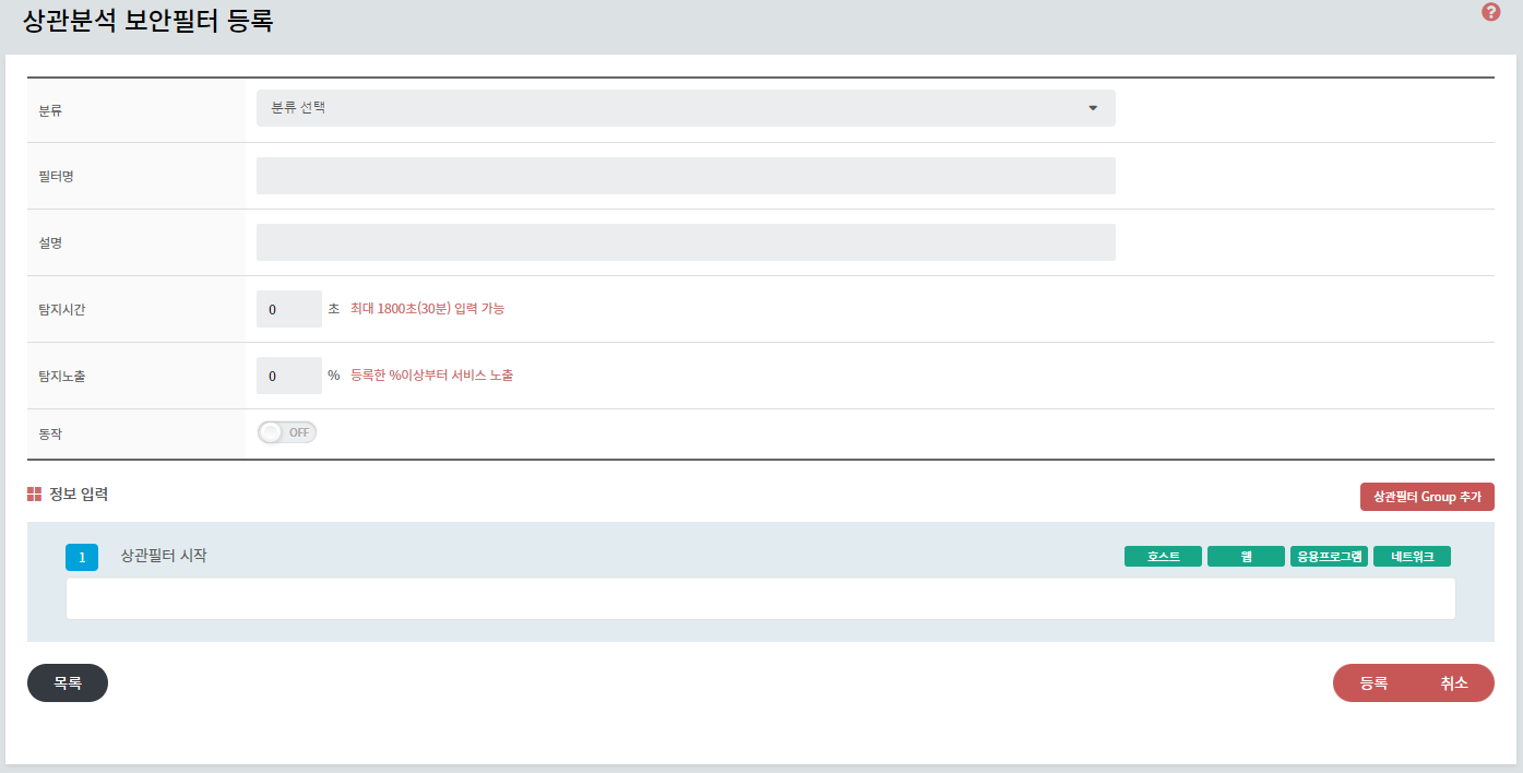 탐지 노출: 등록된 필터 그룹 중 매칭되는 비율(%)에 도달할 경우 필터 탐지 페이지에 노출