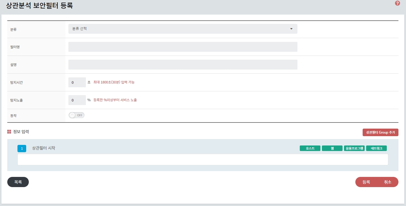 • 상관분석 등록 필터:
