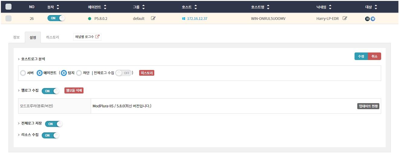 웹 로그 수집 항목에 체크한 뒤, 수정 > 확인 버튼을 클릭하여 설정을 완료합니다.