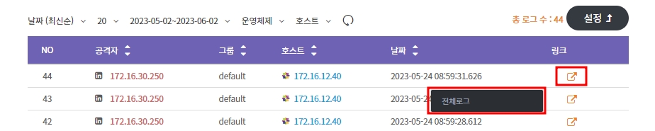 로그 확인: 마우스 오른쪽 버튼을 클릭하거나 "링크" 컬럼의 아이콘을 클릭하여 해당 방어 로그의 전체 로그 페이지로 이동할 수 있습니다.