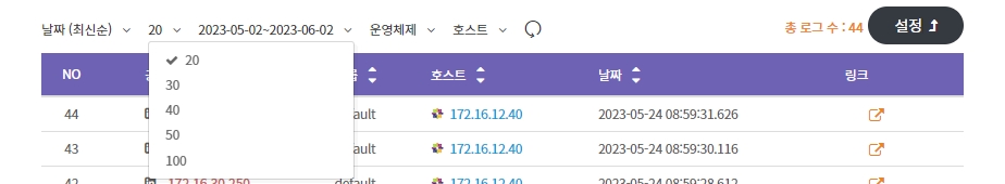 한 페이지에서 표시할 로그의 개수를 설정할 수 있습니다.