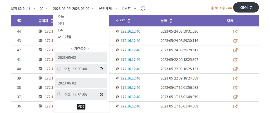 특정 시간대의 로그를 검색할 수 있으며, 과거 1주 또는 1개월 단위로 기간을 확장하여 조회할 수도 있습니다.