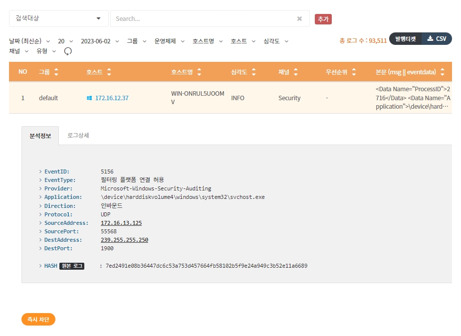 보안탐지, 필터탐지, 전체 로그에서 방어가 필요한 항목을 선택하면, 좌측 하단에 즉시 차단 버튼이 표시됩니다.