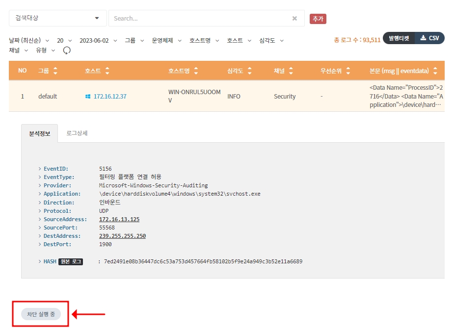 차단이 설정되면, 해당 로그에서 "차단 실행 중" 상태가 표시됩니다.