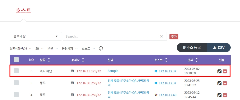 차단 IP 주소 버튼을 클릭하면, 방어 > 차단 IP 주소 페이지로 이동하여 설정된 차단 IP 목록을 확인할 수 있습니다.