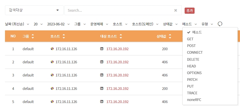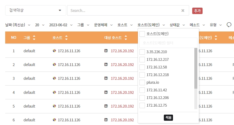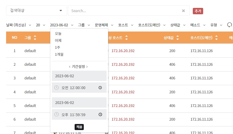 특정 호스트(도메인)을 선택하여 해당 로그를 정렬할 수 있습니다.