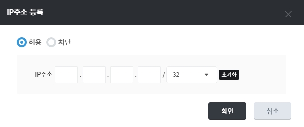 접근 제한 > IP 주소 > "등록" 버튼을 클릭하여 특정 IP에 대해 접속 허용 또는 차단을 설정할 수 있습니다.