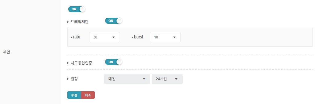 트래픽 제한, 시도 응답 인증, 일정 변경 등을 통해 웹 방화벽 제한 설정이 가능합니다.