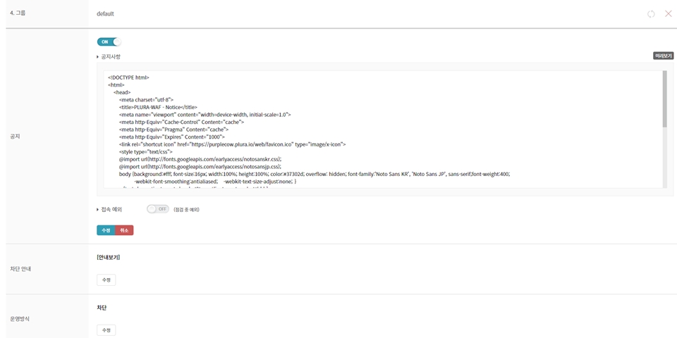 그룹별로 웹 방화벽 공지를 설정할 수 있습니다.