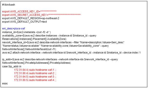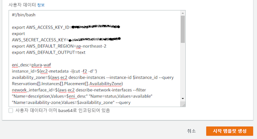 user-data에 입력합니다.네트워크 인터페이스의 설명 항목에 "plura-waf"를 입력해,